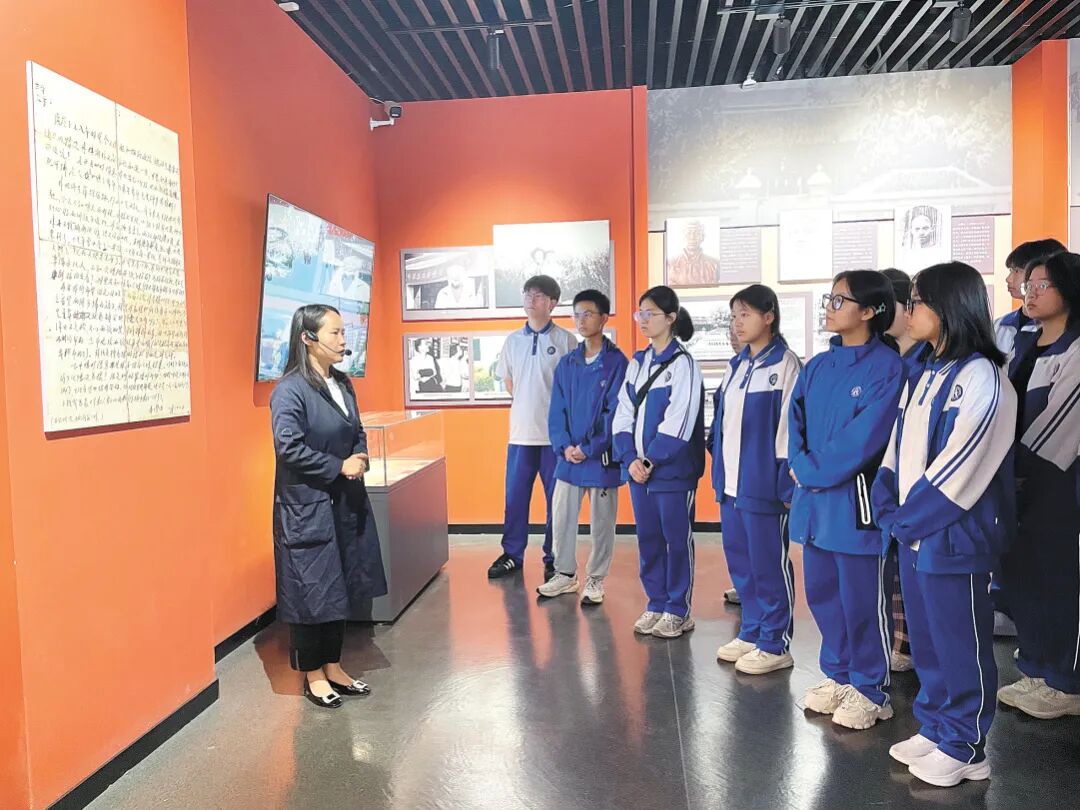 ▲讲解员汪满为黄州区一中学生讲解陈潭秋托孤家书。记者 李娇 摄