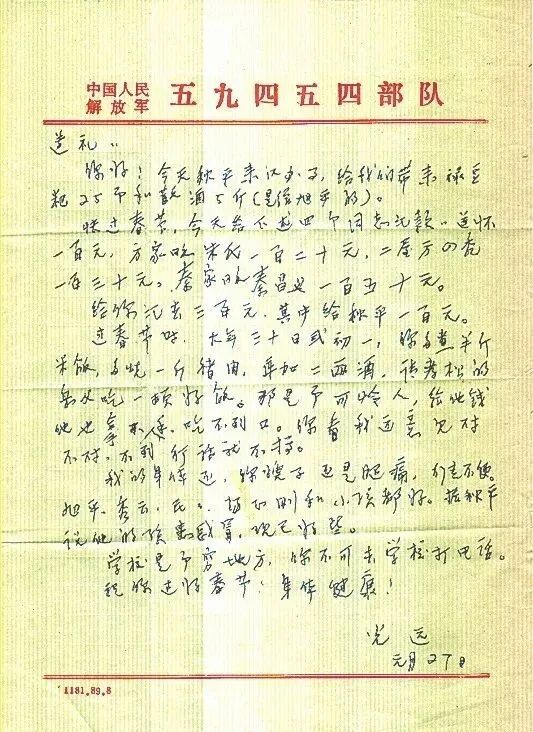 红军烈士的家属和子女,秦光远将军也是给予无微不至的关怀关爱。1999年1月27日写给弟弟秦遵礼的信中,他写下了这样一段叮嘱的话:“快过春节,今天给下述四个同志汇款,遵怀一百元,方家畈朱氏一百二十元,二屋方四秃一百三十元,秦家畈秦昌义一百五十元。过春节时,大年三十或初一,你多煮半斤米饭,多烧一斤猪肉,再加二两酒,请孝松的岳父吃一顿好饭。”