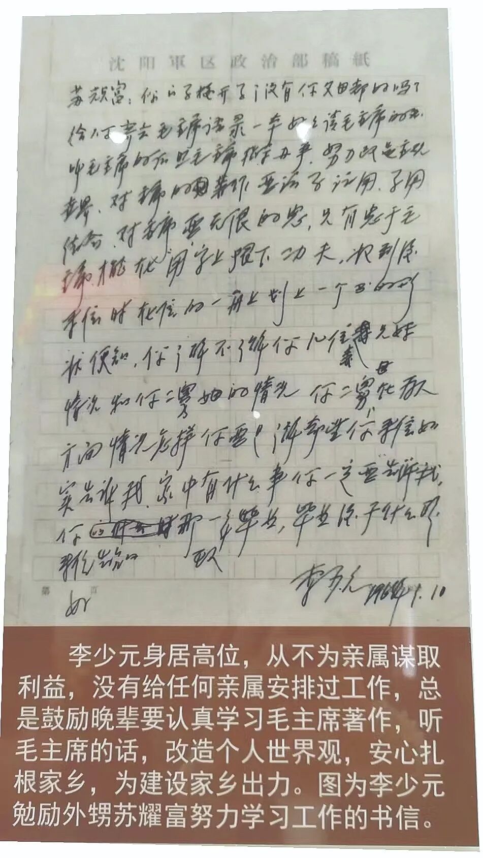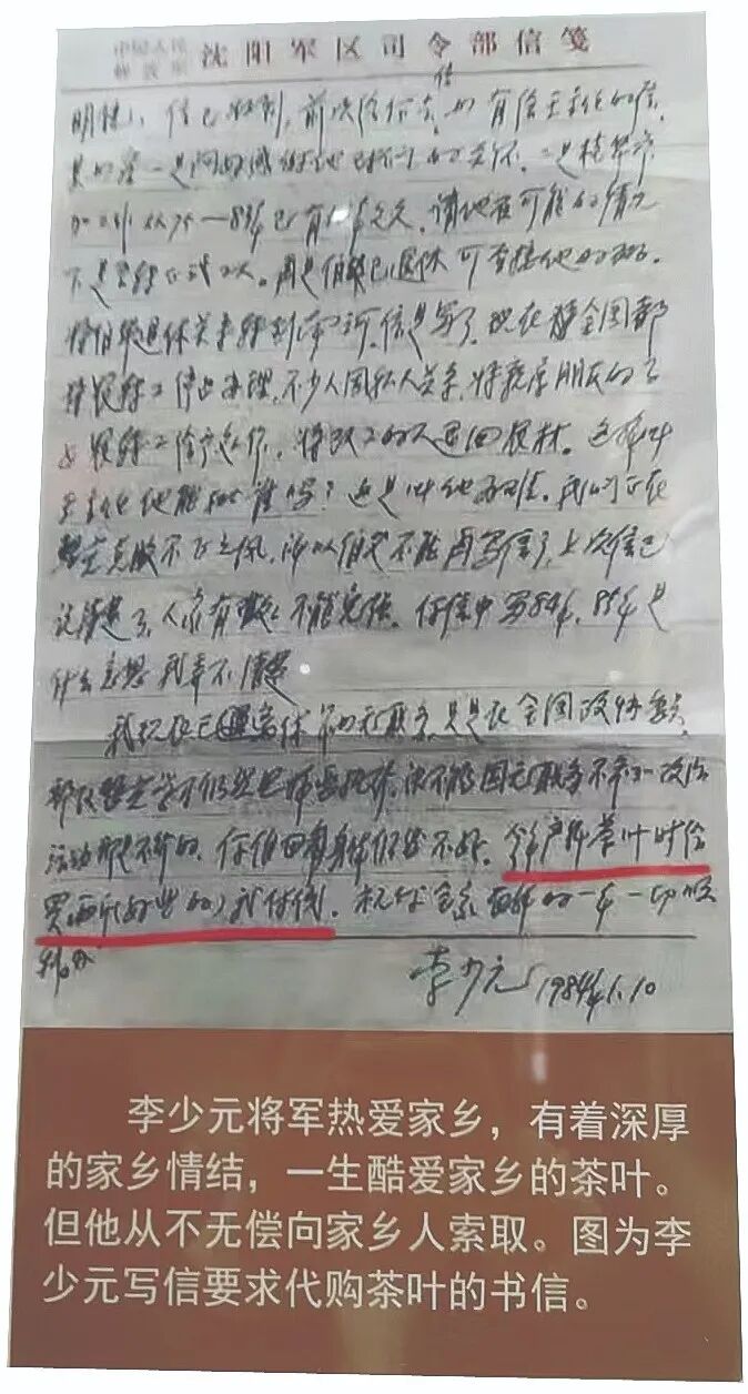 “……给你寄去毛主席语录一本,好好读毛主席的书……”“……今年产新茶叶时给我买两斤(好些的),我付钱……”展出的这两封家书分别是开国少将李少元写给外甥苏耀富和侄子李明镜的。