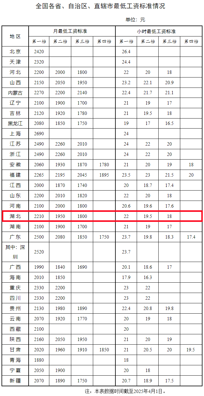 湖北第一档月最低工资标准为2210元第一档小时最低工资标准为22元