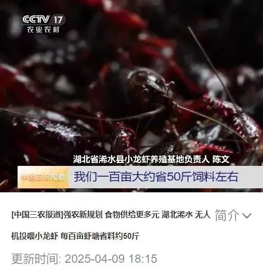 4月9日,CCTV17《农村农业》频道报道湖北浠水无人机投喂小龙虾,每百亩虾塘省料约50斤,为农业生产助力。