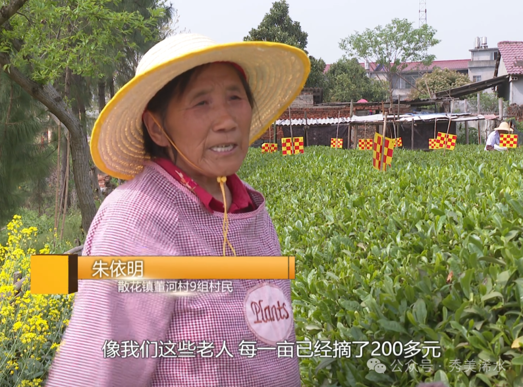 散花镇董河村9组村民 朱依明:像我们这些老人,已经摘了200多元,采多少得多少。