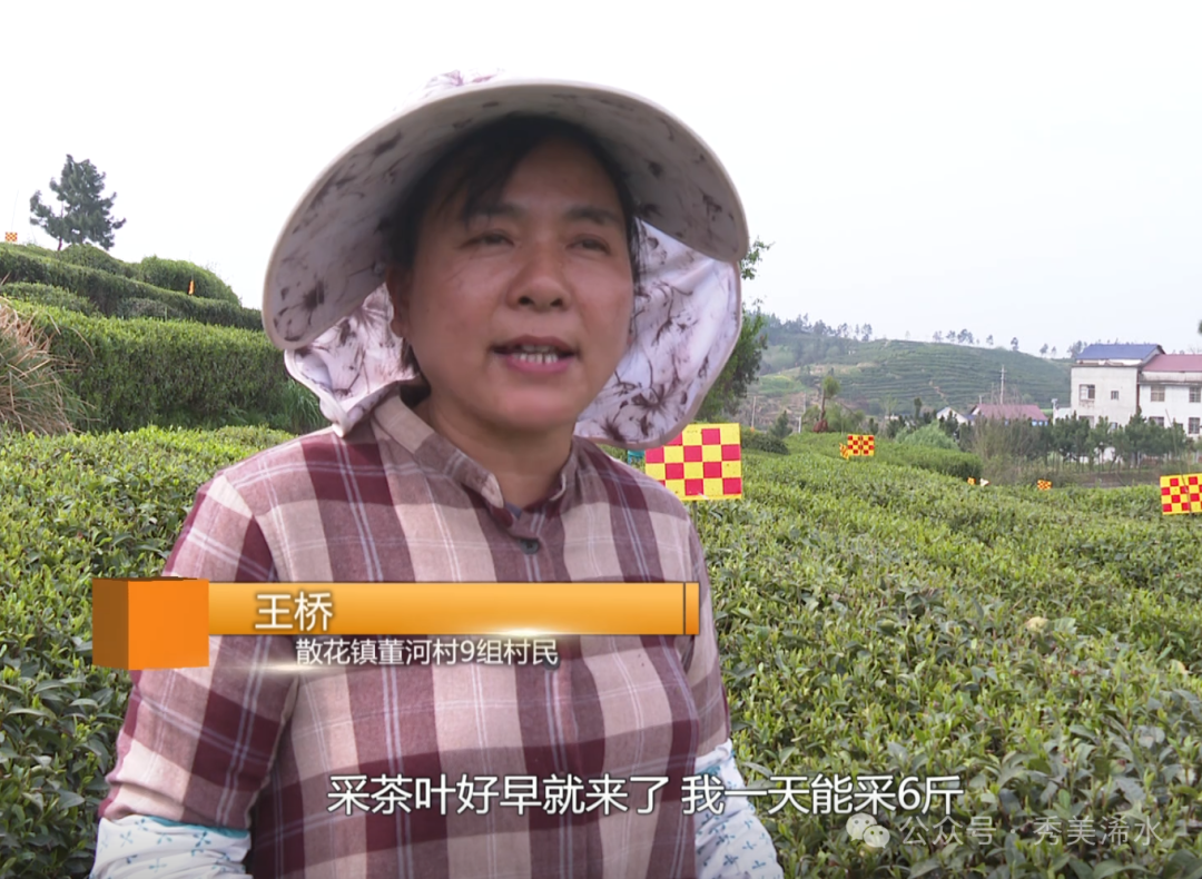 散花镇董河村9组村民 王桥:好早就来采茶叶了,我一天能采6斤,收入一亩差不多有七八千块,肯定比种地划得来。