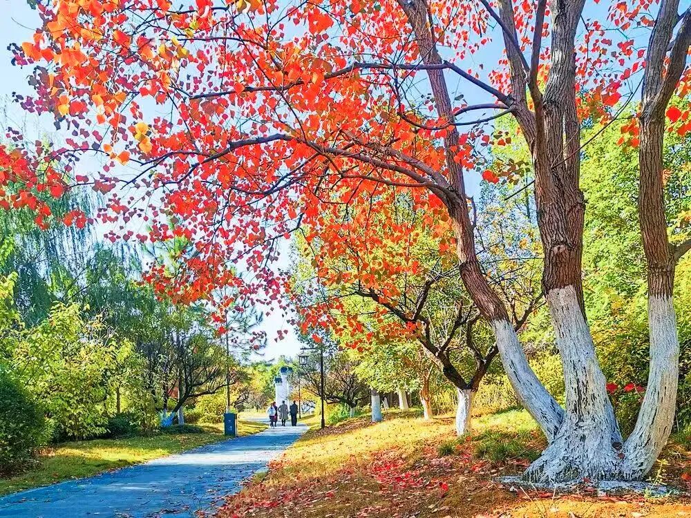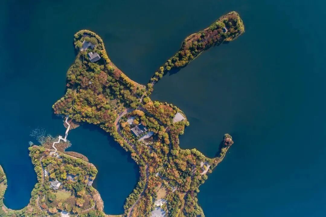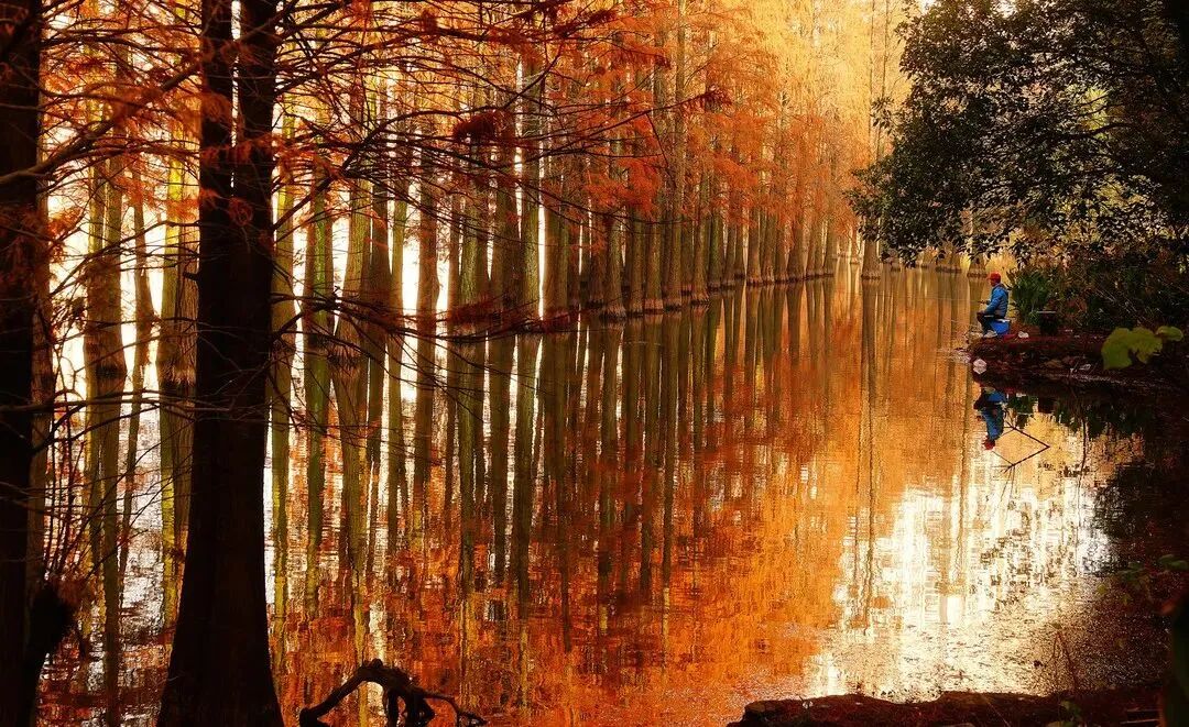湖中整整齐齐矗立着几百棵水杉,像极了威风凛凛的仪仗队。秋风袭来,它们慢慢变黄,变成金黄,成为摄影家镜头下的极品景观。