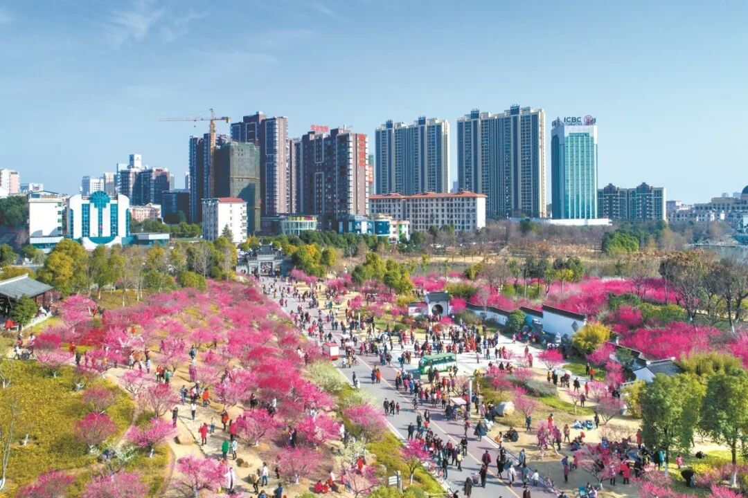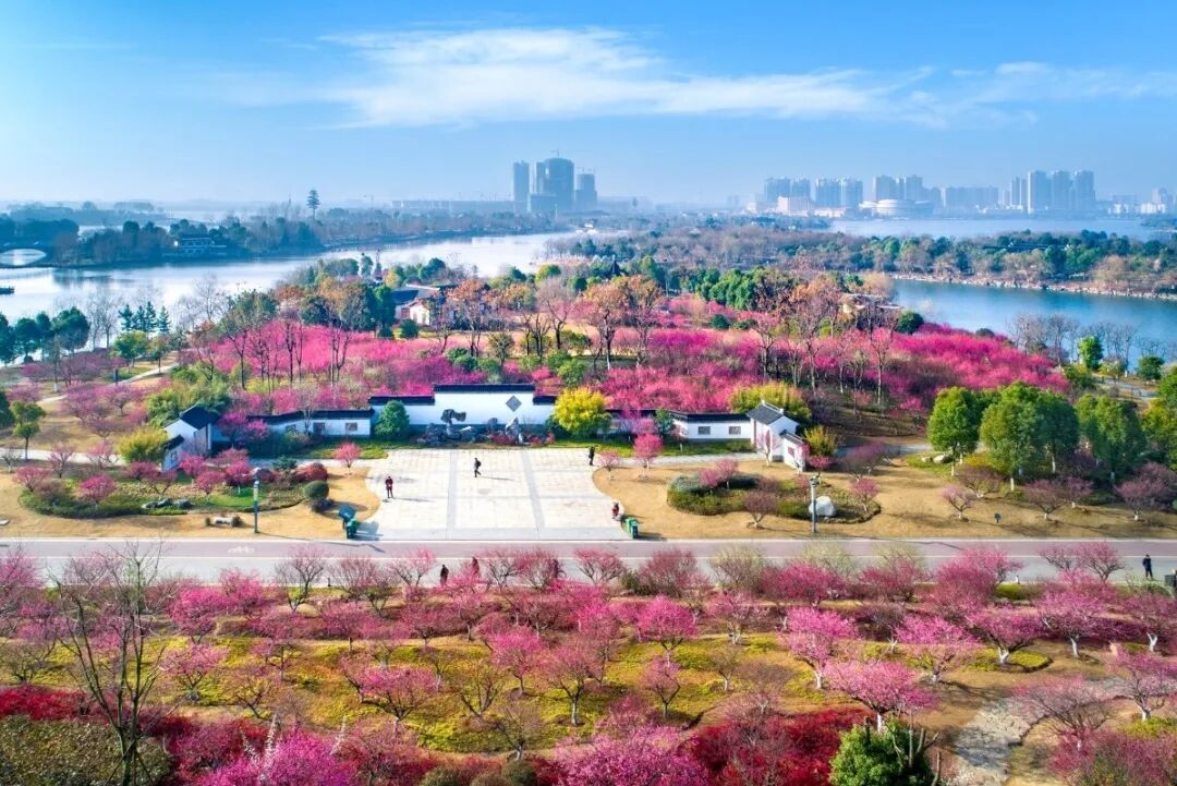 这个景区的主题是梅花,种植了四千余株品种繁多的梅花树。每年春节前后,千姿百态的梅花在雪花飞舞中、在玉洁冰清中盛大开放,红透了半边天,让游人羞红了脸,沁人心脾的清香浓得让人喘不过气来。看花的人摩肩接踵,徜徉在花海中,笑得和花一样灿烂。
