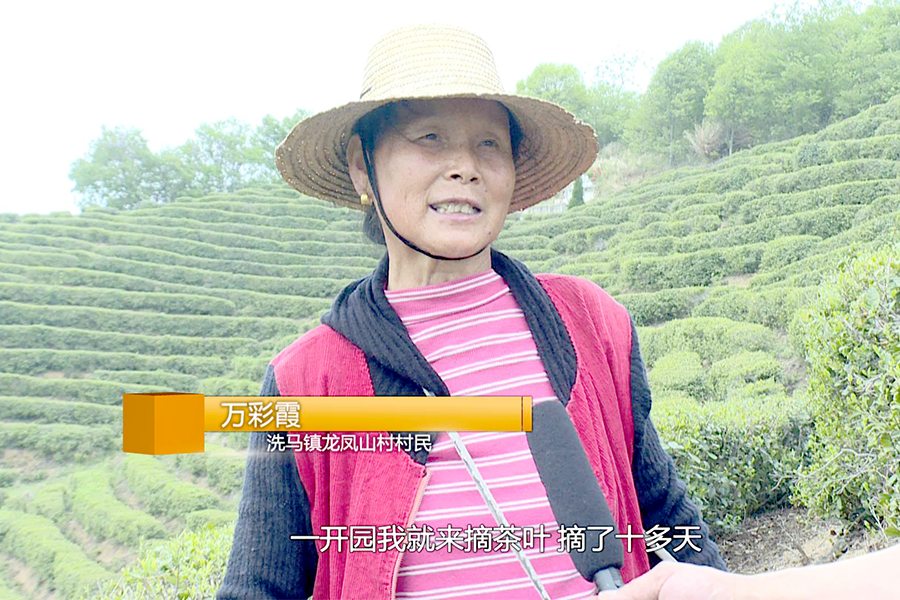 洗马镇龙凤山村村民 万彩霞:一开园我就来摘茶叶,摘了十多天,每天摘六七斤,一天一百多块钱。