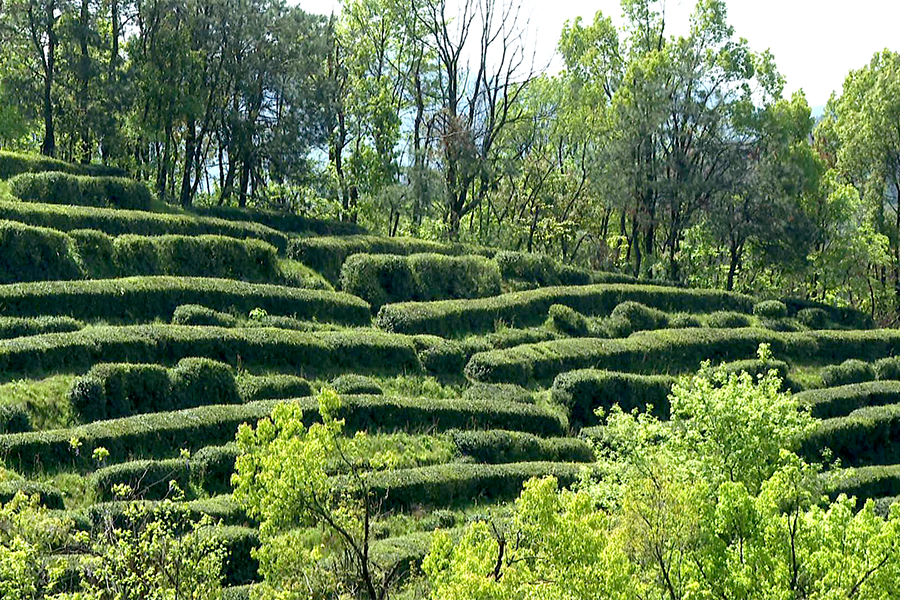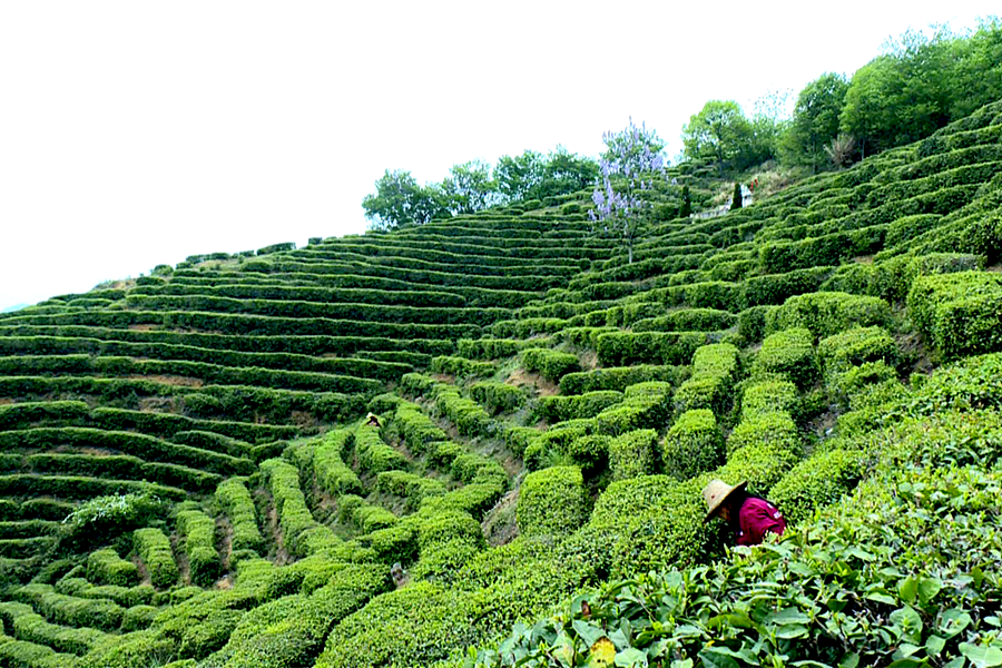 走进龙凤山茶园,茶树分布在龙凤山南侧及其延展的山岭,三面环山的茶园呈梯形地貌,茶山梯度均匀,线条清晰,蔚为壮观。眼下正是春茶采摘时节,一大早,村民们就三五成群地在茶园茶垄间穿梭,一起采摘今年的新茶。