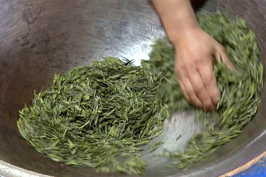 一叶一芯品相最好。村民万彩霞是一名老茶人,采茶已有三十年,她用指腹在茶树上轻轻一提,嫩芽即离枝,不一会儿篓底就铺满鲜绿。