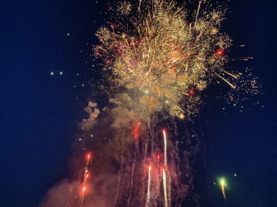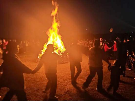 夜幕降临,文化节惊喜延续。璀璨烟花在紫云英花海上空绽放,如繁星般坠落人间。篝火晚会上,游客们手拉手围火起舞,火光映照着一张张笑脸。