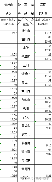 (2)武汉-杭州西G4565停靠武汉、浠水南、蕲春南、黄梅东、安庆、池州、九华山、黄山北、绩溪北、千岛湖、建德、富阳西、杭州西13座车站