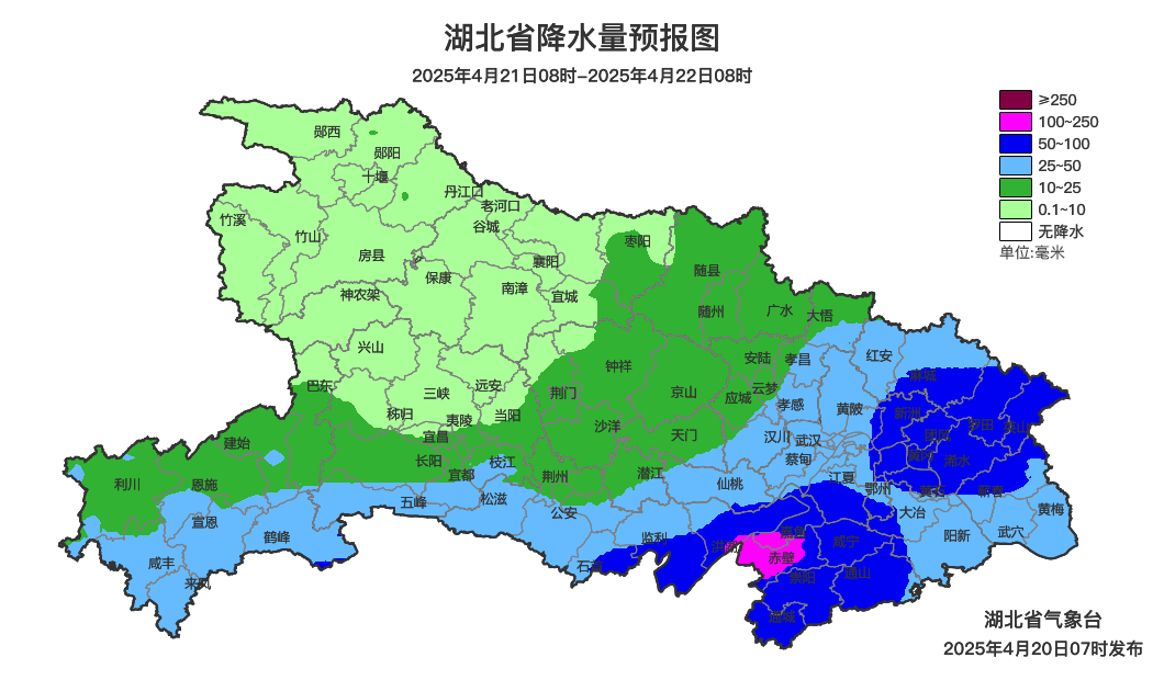 4月21日08时-22日08时,鄂西南中到大雨,局地暴雨;江汉平原南部、鄂东北、鄂东南有大到暴雨,局地大暴雨;其他地区小到中雨,夜间转阴天。省内部分地区伴有短时强降水、雷暴大风、冰雹等强对流天气。