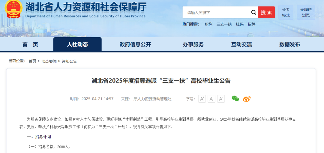 报考人员可于4月21日起登录湖北省人事考试网查询。各地各服务岗位的具体招募计划及岗位要求等详见《2025年度湖北省“三支一扶”高校毕业生招募选派计划表》。有关事项咨询可直接与相关市州“三支一扶”办联系(联系方式附后)。