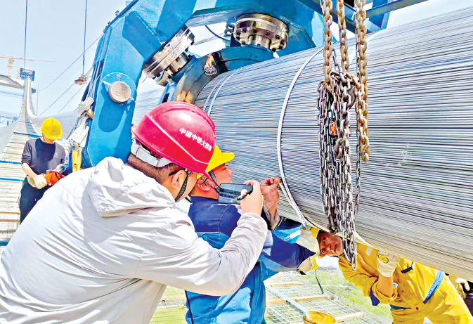 双柳长江大桥项目现场,工人们正在进行主缆紧缆施工。 通讯员祁钟 摄