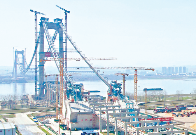 近日,双柳长江大桥南岸,长长的猫道跨过长江,串起了大桥南北两岸,大桥的主缆已经架设完工。工人们正在进行紧缆施工,为钢箱梁吊装施工做准备。在双柳长江大桥下游约50公里处,燕矶长江大桥正在紧锣密鼓地架设主缆,平均每天拉索5根左右。