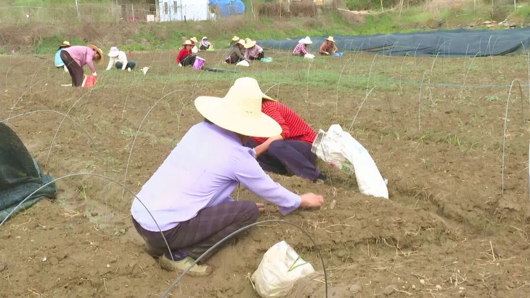 在凤山镇大塘湾村湖北创伟农业发展有限公司草本中药材种植基地,村民抢抓晴好天气,对药材苗进行除草管理,确保药材苗的营养吸收。