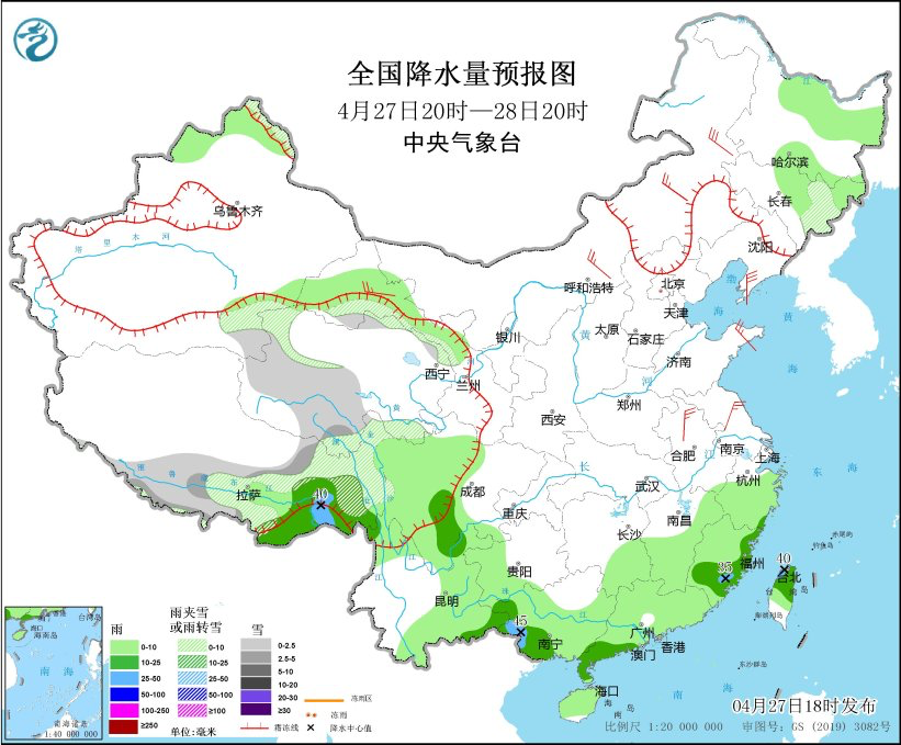 中央气象台预计,27日20时至28日20时,青海西部和南部、甘肃河西、吉林东部、西藏东部和南部、川西高原中北部等地部分地区有小到中雪或雨夹雪。黑龙江北部、吉林中部、江南中南部、华南大部、四川西部和南部、贵州西部、云南大部、西藏东南部等地部分地区有小到中雨。