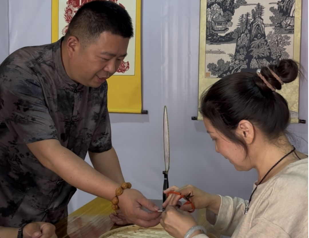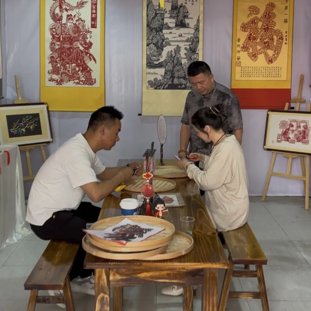 非遗糖画和剪纸摊位前围满了天真可爱的小朋友。糖画艺人手中的糖稀如灵动的丝线,在石板上快速勾勒出各种栩栩如生的形象,引得小朋友们阵阵惊叹;剪纸艺人手中的剪刀则如神奇的魔法棒,在红纸上轻盈舞动,不一会儿,一幅幅精美的剪纸作品便呈现在眼前,让孩子们目不暇接。