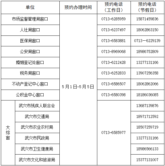 武穴市政务服务中心“五一”假期开展“不打烊”服务,采取“电话预约、现场办理”的方式办理,申请人可通过电话进行咨询及预约登记,备齐办事材料,按约定时间和方式办理。