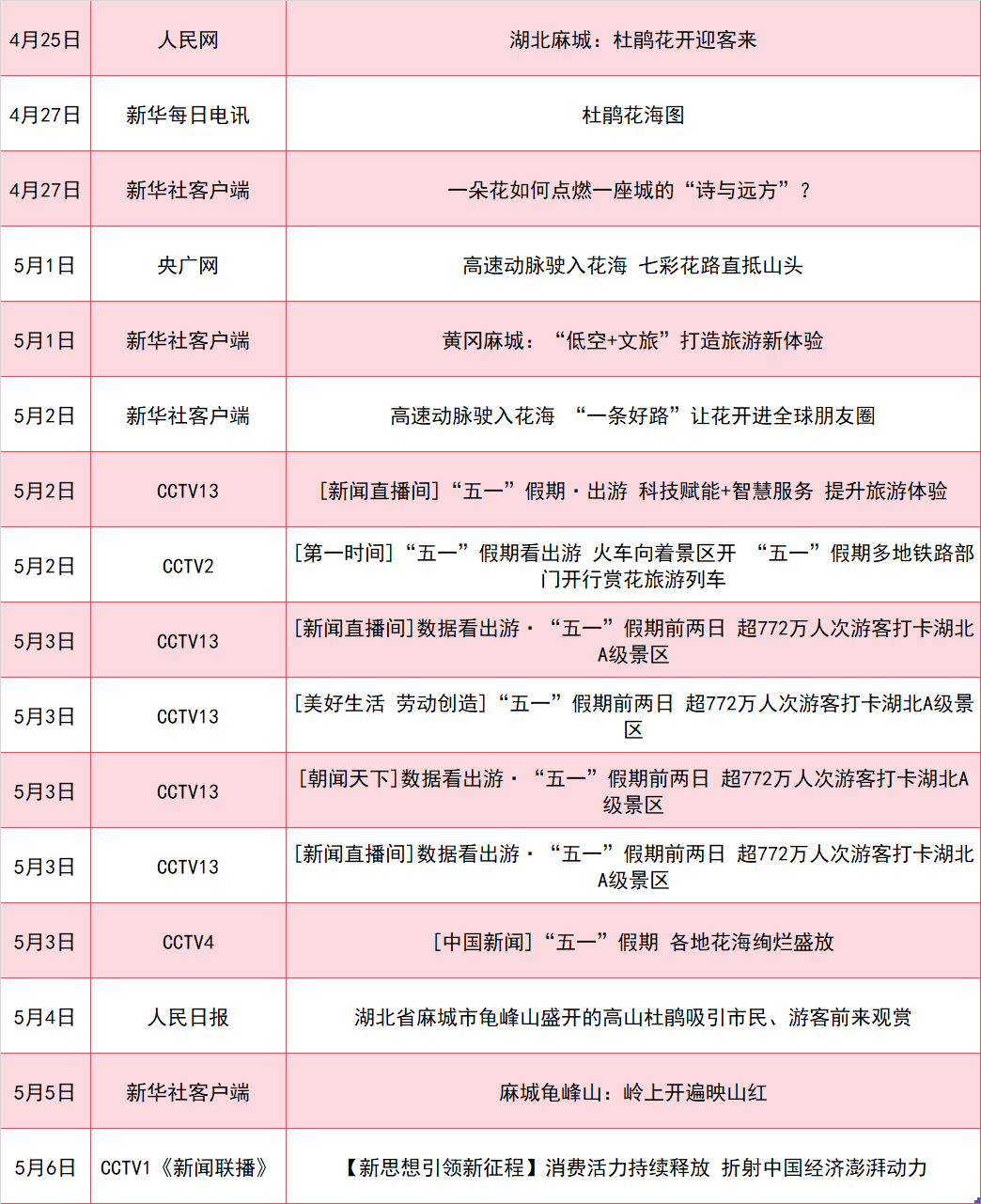 5月6日,麻城杜鹃花再次登上《新闻联播》,在《消费活力持续释放 折射中国经济澎湃动力》板块中惊艳亮相。短短几秒的镜头,却让全国观众记住了这片“大别山上最美红飘带”!网友纷纷感叹:“原来湖北还藏着这样的宝藏花海!”“明年五一,必须安排!”
