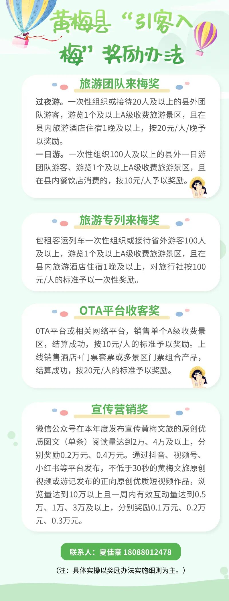 为进一步引客入梅,推进文旅产业高质量发展,黄梅出台了《黄梅县“引客入梅”奖励办法》,对旅游团队来梅、旅游专列来梅、OTA平台收客、宣传营销方面予以奖励。快来看看吧。“引客入梅”多重优惠大礼包 来源:黄冈政府网 编辑:何斌