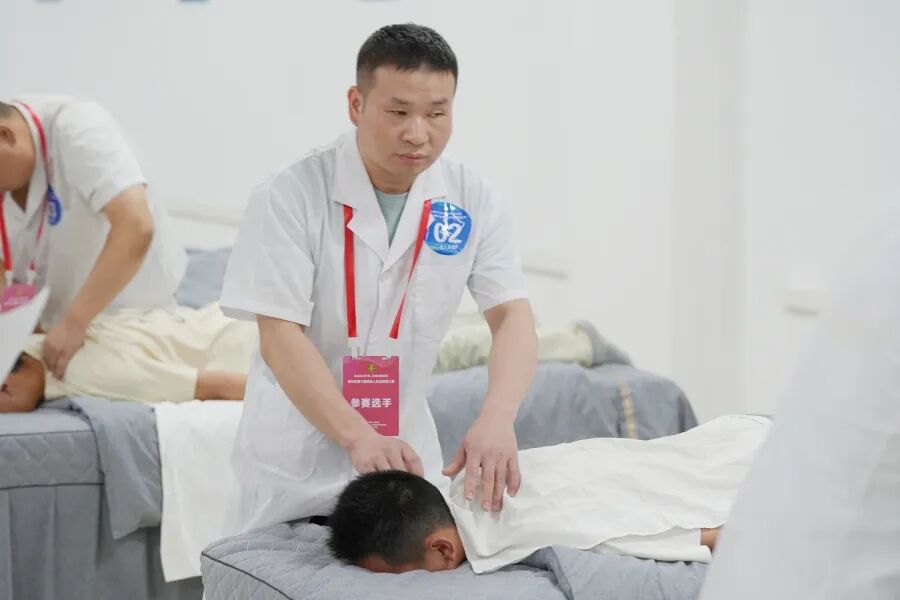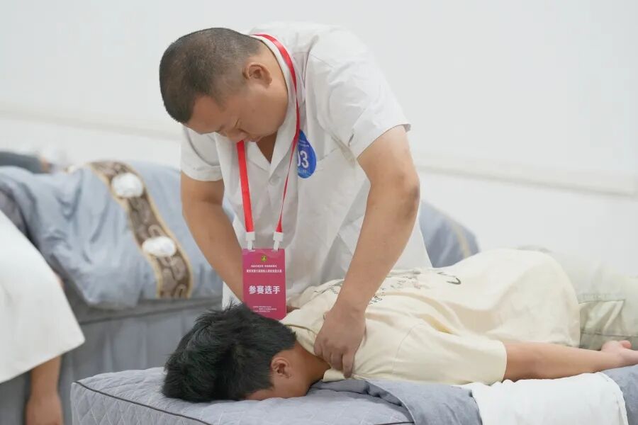 盲人按摩赛场则充满了宁静而专注的力量。选手们全神贯注,仅凭敏锐的触觉和炉火纯青的技艺,就能在“顾客”身体上精准找到穴位,推、拿、按、摩,手法娴熟流畅,为顾客带来极致舒适的按摩体验,用双手传递温暖与专业。