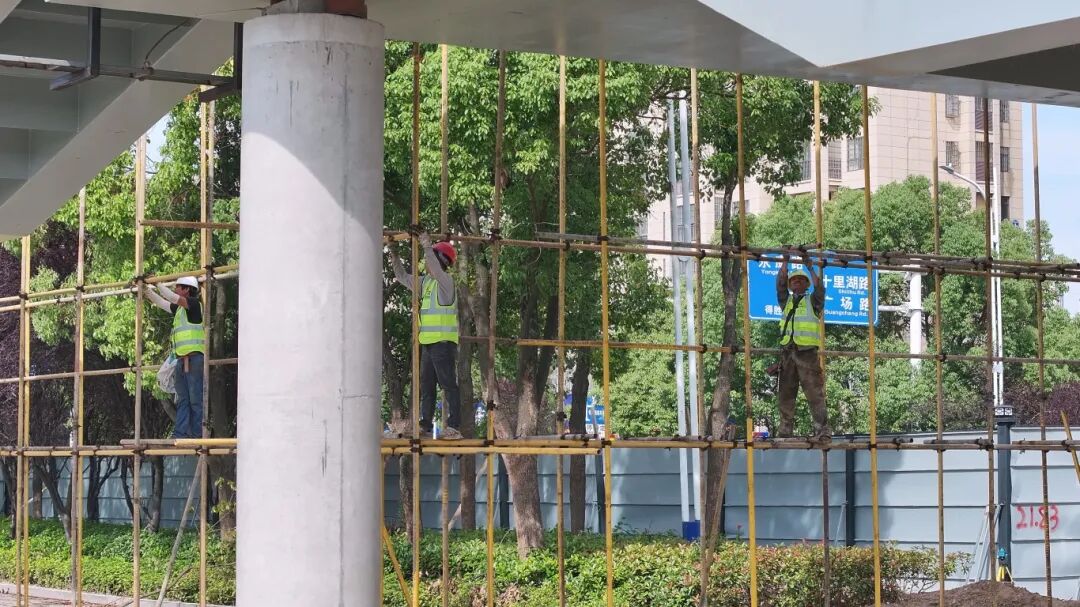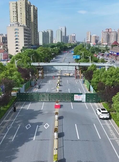 来到项目施工现场,通过航拍镜头可以看到,人行天桥钢结构主桥和梯坡道主体架设已经吊装完成,人行天桥已初现雏形。施工单位按照施工标准,进行搭设安全围挡作业,施工人员在各作业点上有条不紊地进行封闭施工最后的冲刺。据了解,5月18日左右,迎宾大道上这一段封闭道路将恢复机动车通行。