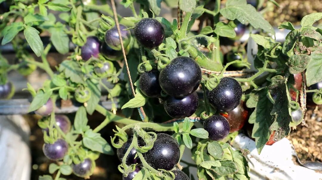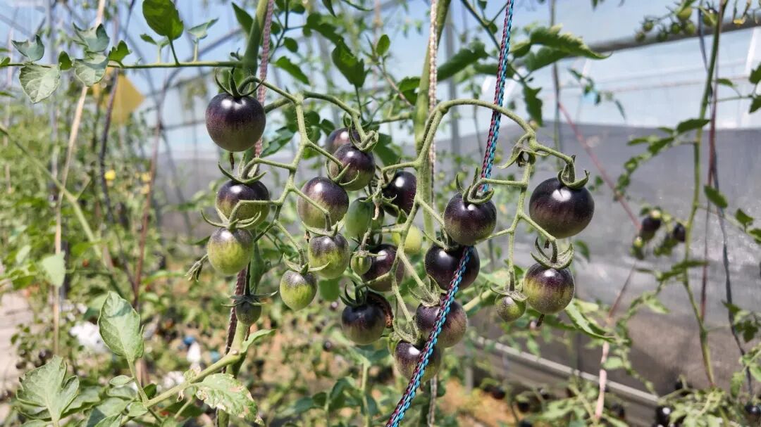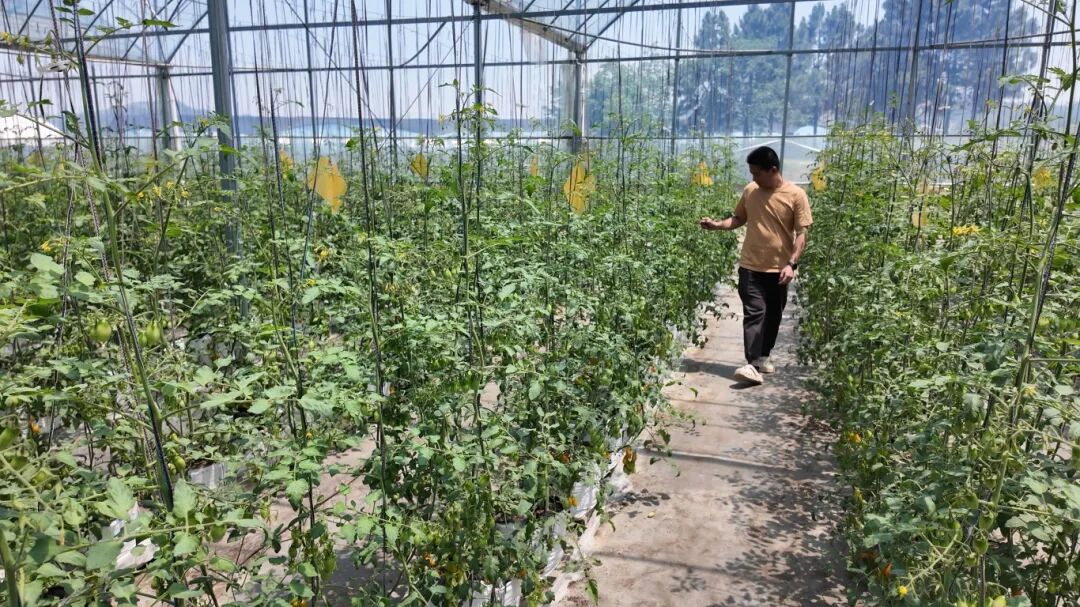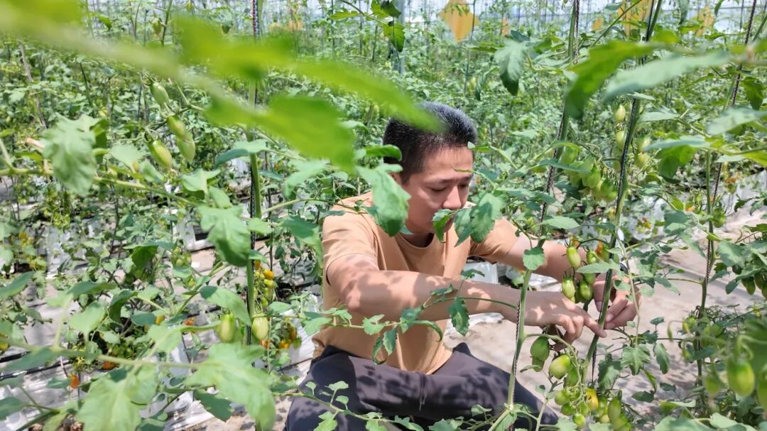 为了保证番茄的品质和产量,农场采用先进的种植模式和科学化管理方法。在一座用于品种试验的大棚中,漆晟杰正细致观察不同番茄品种的生长表现,为下一季的选种做准备。