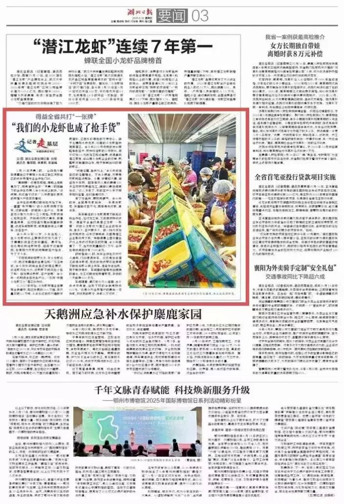 一车车鲜活的小龙虾源源不断地运到合作社,经过加工后,又迅速被转运送走。“得益于全省打造潜江龙虾‘一张牌’,我的小龙虾成为潜江企业的抢手货,有多少,客户要多少。前一阵外贸发生关税波动,山东订单锐减,也都是潜江企业帮我兜了底。”电脑屏幕上显示着生产线上传送过来的实时数据,余小兵盘算了一下,当天收购量超过8万斤,合作社净利润估计有7000余元。