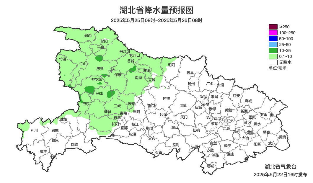 5月25日08时-26日08时,鄂西北、鄂西南北部多云有阵雨或雷阵雨;其他地区多云到晴天。最高气温24~29℃,最低气温16~20℃,偏东风2到3级。