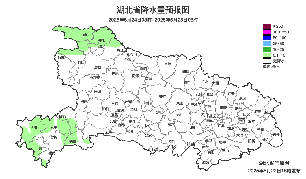 5月24日08时-25日08时,全省多云到晴天,其中鄂西北、鄂西南局地有阵雨或雷阵雨。最高气温25~29℃,最低气温14~18℃,偏北风2到3级。