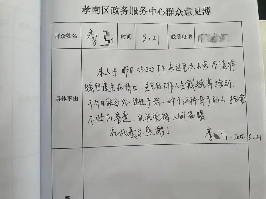 失而复得的喜悦让李先生感慨万千,他在信中不仅对“孝着办”帮办人员拾金不昧的个人品德表达诚挚感谢,更对“孝着办”服务团队专业素养和孝南区政务服务中心热情为民、认真负责的优质服务给予高度赞扬。