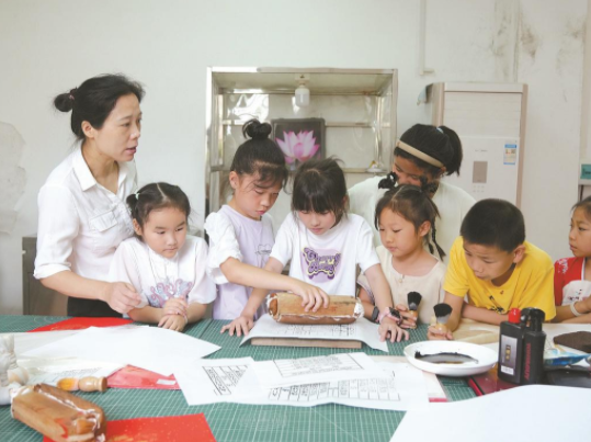 “大家看这块诗词的雕版,它的每个字都是反向凸起的,就像印章一样。”叶映红举起一块泛着幽光的梨木板,学生们立刻发现了玄机——木板上的字是反刻的。当蘸满墨汁的棕刷在雕版上均匀游走,覆上宣纸轻轻按压,奇迹发生了:原本反向的文字在宣纸上呈现出工整的宋体,引得一阵惊呼。“这可比打印机酷多了!”男生王镇齐一边尝试拓印,一边兴奋地数着雕版上的笔画,“每一刀都是古人‘手写’的诚意。”