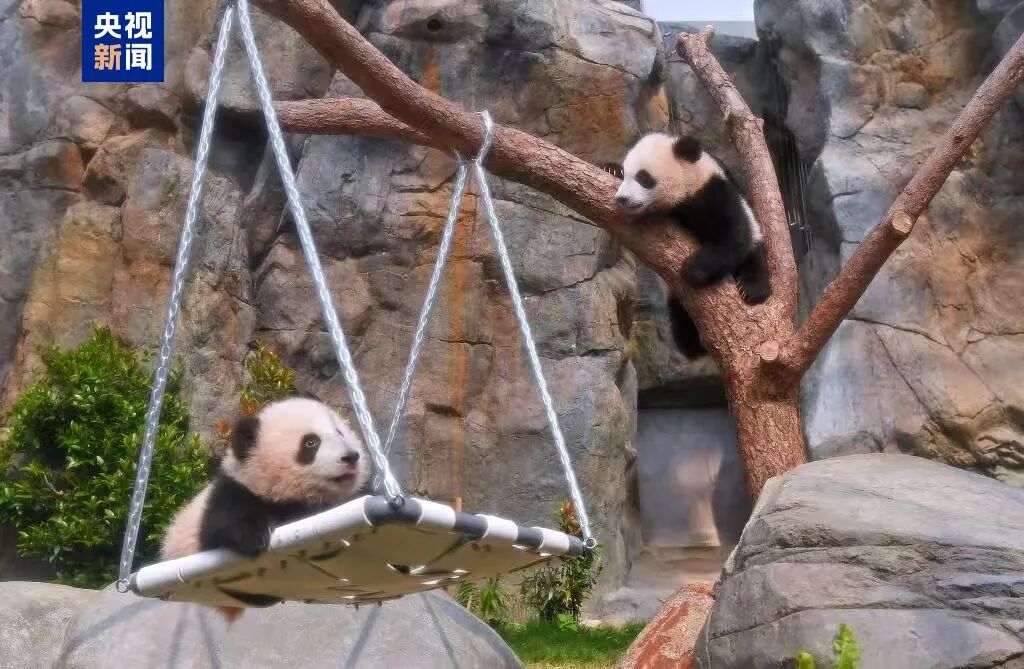 27日,香港海洋公园公布在港出生的首对大熊猫龙凤胎幼崽名字,雌性名为“加加”,雄性名为“得得”。
