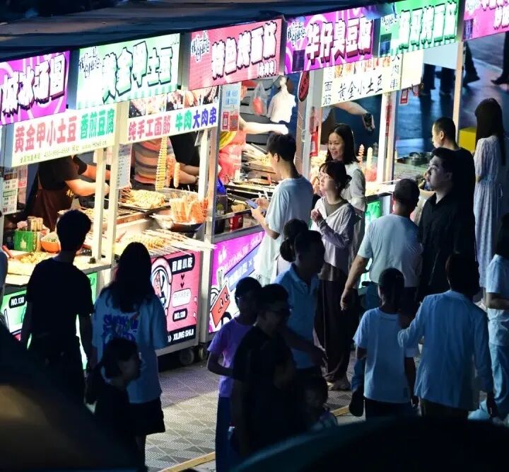 新派小吃也不甘示弱,会爆浆的芝士烤榴莲、裹满辣子的烤猪蹄、比脸还大的网红冰激凌,整条街飘着花椒香和年轻的笑闹声。