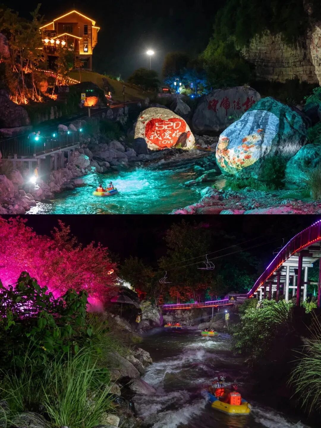 朝天吼夜漂是一场超越白昼的奇幻之旅,不仅保持了自然风光的原始魅力,还通过全域灯光照明营造了一个梦幻般的夜漂体验。