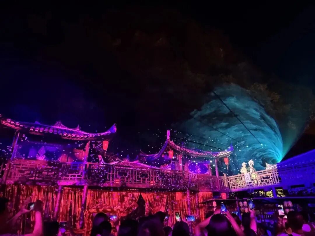 夜游项目《梦回车溪》在车溪老街上打造三大特色演区,呈现《巴楚古纪》《十里红妆》《生生不息》《篝火狂欢》四场主题演艺,通过光影科技与戏剧互动的深度融合。