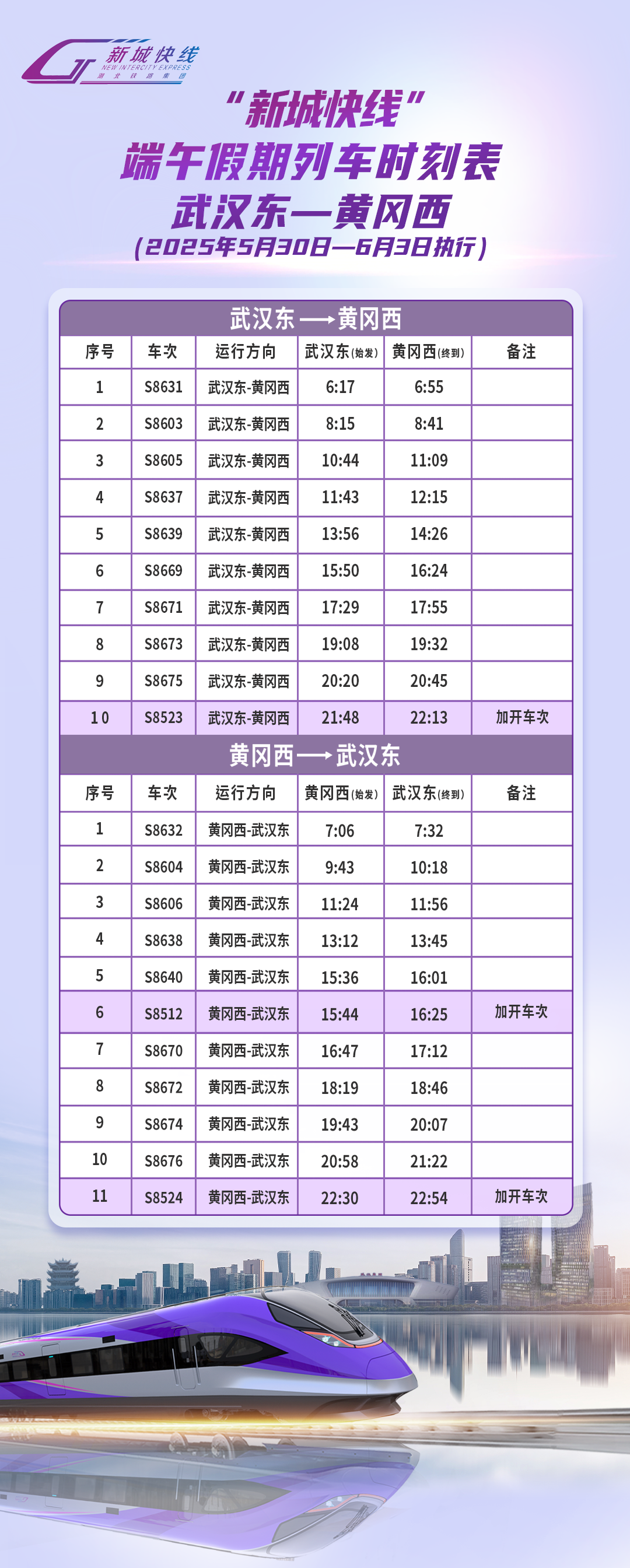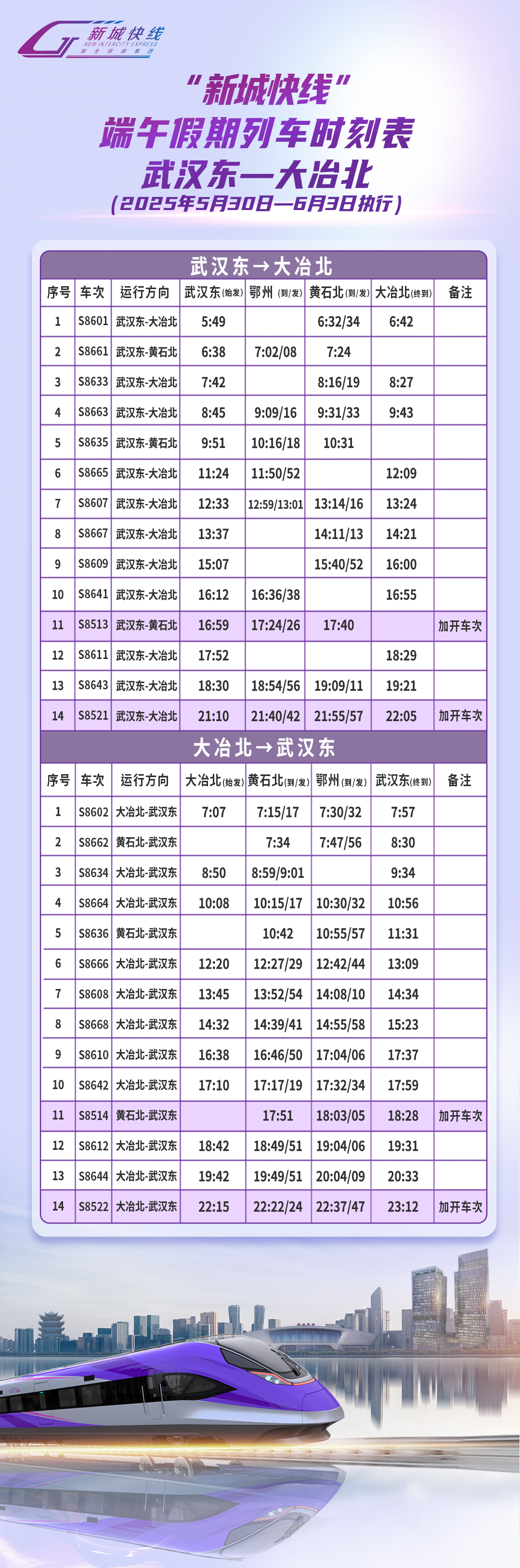 具体详情请随时关注“湖北铁路集团轨道运营有限公司”微信公众号,线上实时查询支付宝、微信“新城快线乘车码”小程序中列车开行信息,请关注车站列车开行公告。