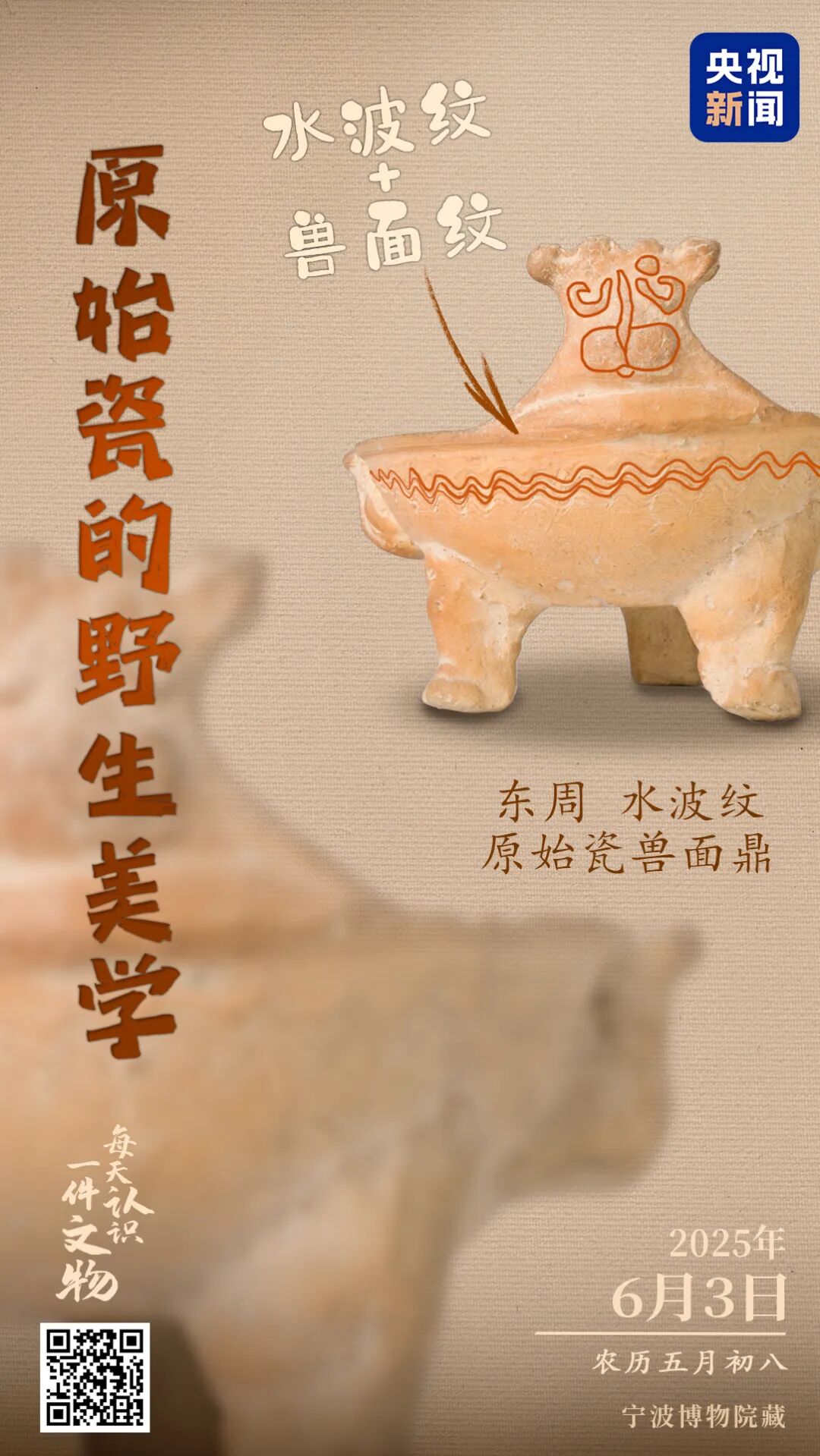 央视新闻联合全国博物馆推出文博科普产品《文博日历》,每天带你认识一件文物。东周水波纹原始瓷兽面鼎,现藏于浙江宁波博物院,猜测是用来装食物或调料的器具。原始瓷作为陶器向瓷器发展的“过渡产品”,有着古朴的外形和青黄、黄褐的斑驳釉色。这件鼎上,还有看不清的“表情”兽面纹,以及江南水乡的“特产”水波纹,满满原始之美。识别图中二维码查看详情↓