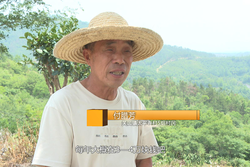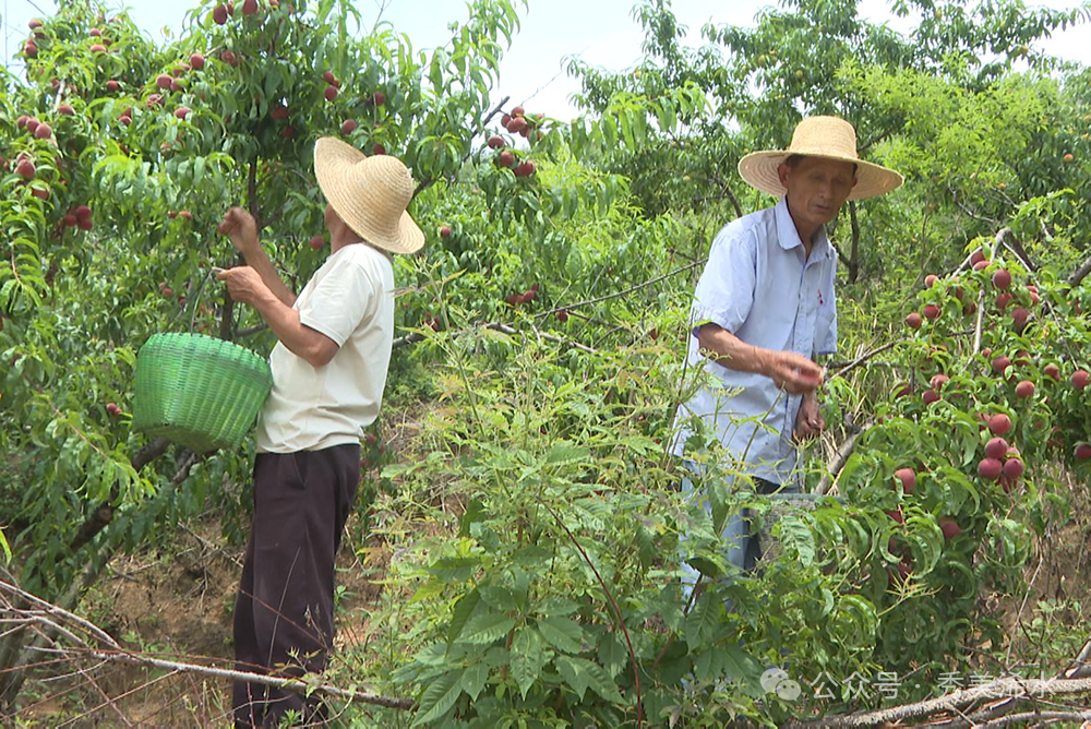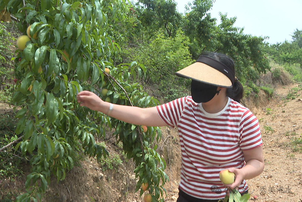 关口镇太平寺村5组村民 付腊芳:我已经在这里务工6年了,每年收入大概在3~4万块钱。两个人在这里,基地没有欠我们一分钱。桃园从正月到2月之间要修枝,3月正式上肥料,一直管理到现在。