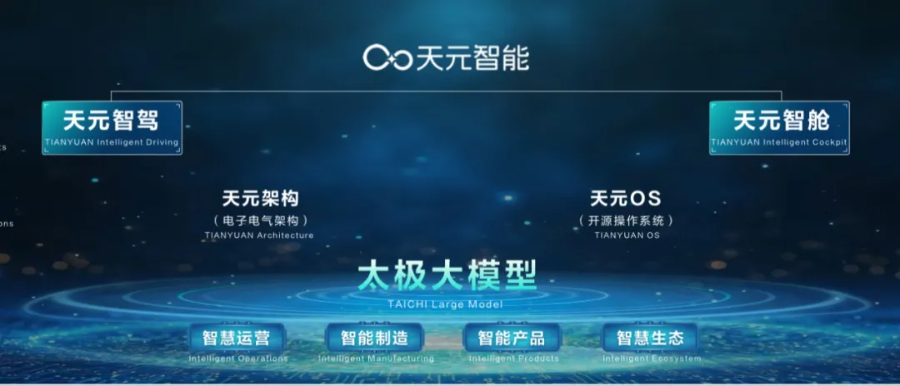 “一核”为企业级太极大模型,具备全域融合、全场景赋能、持续自主进化三大核心特征。“双基”为天元架构、天元OS,天元架构实现动力域、车身域、座舱域、智驾域四个区域控制的深度融合,天元OS面向行业开源,致力于为乘用车、商用车领域提供底层软件平台。“双元”应用为天元智驾和天元智舱,天元智驾提供从NOA辅助驾驶到L4、L5级无人驾驶的全场景应用,天元智舱构建“视觉+语音+生物感知”三位一体的智慧中枢。“天元智能”技术品牌,以最懂中国道路的智能化方案,实现智能和安全的共融。