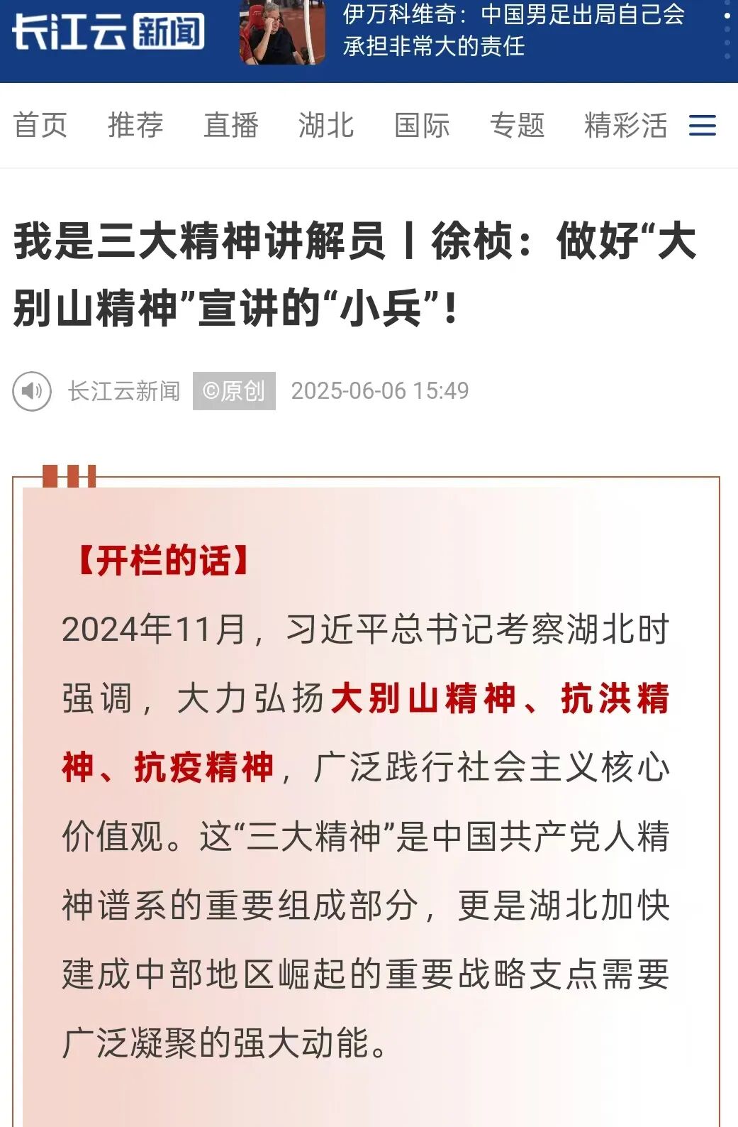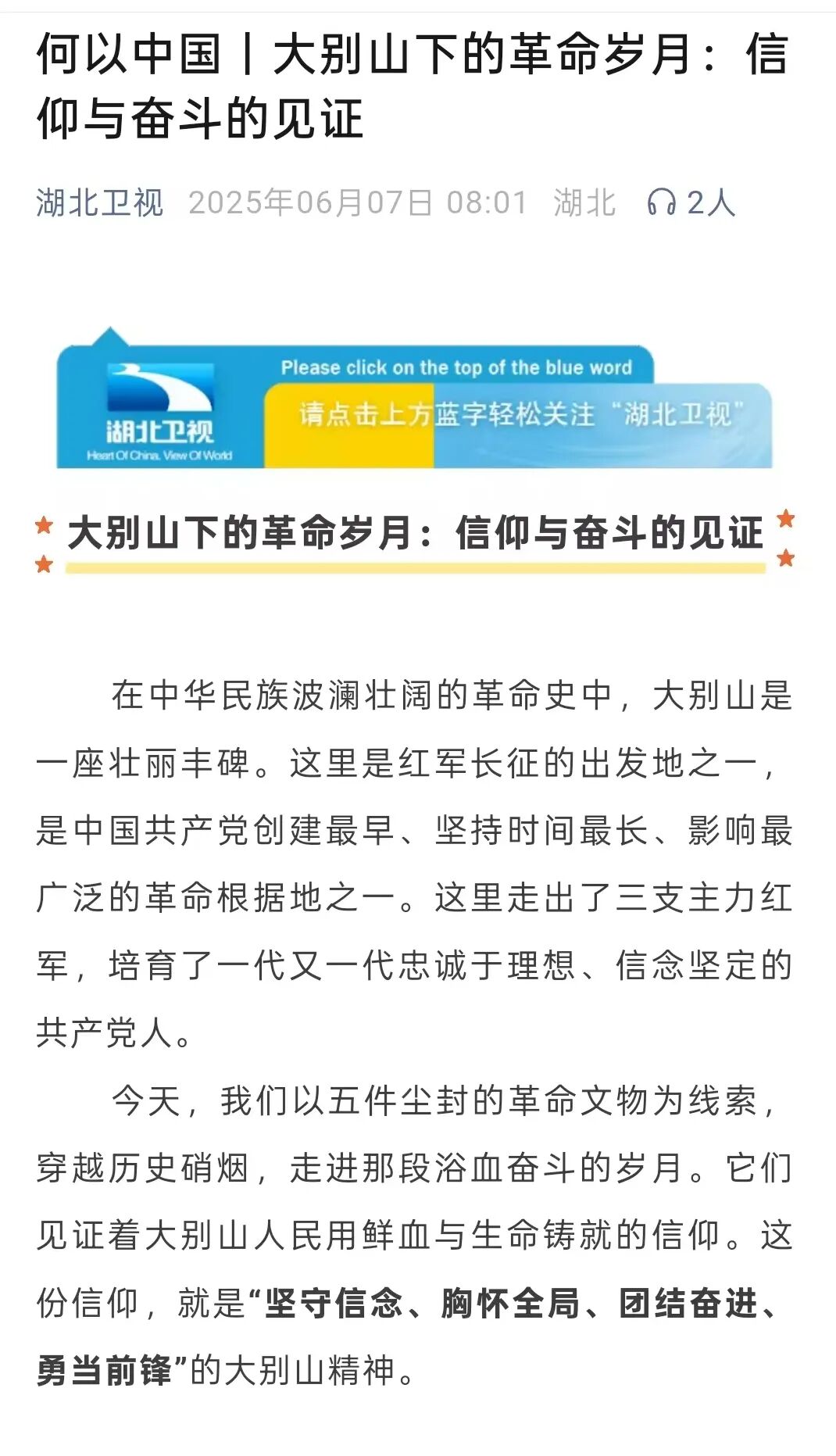 6月7日,湖北卫视微信公众号报道了大别山人民用鲜血与生命铸就的信仰:“坚守信念、胸怀全局、团结奋进、勇当前锋”的大别山精神。长江云新闻