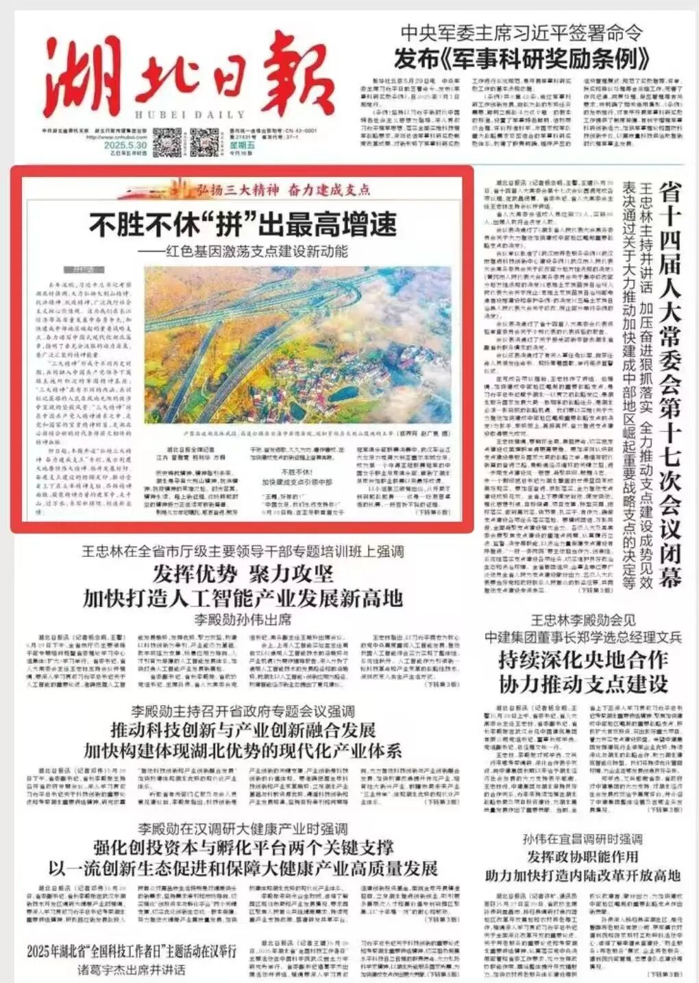 5月30日,湖北日报头版报道包括黄冈在内的湖北各地弘扬"三大精神",鼓足干劲、奋发进取,久久为功、善作善成,在加快建成支点的新征程上奋勇奔跑。