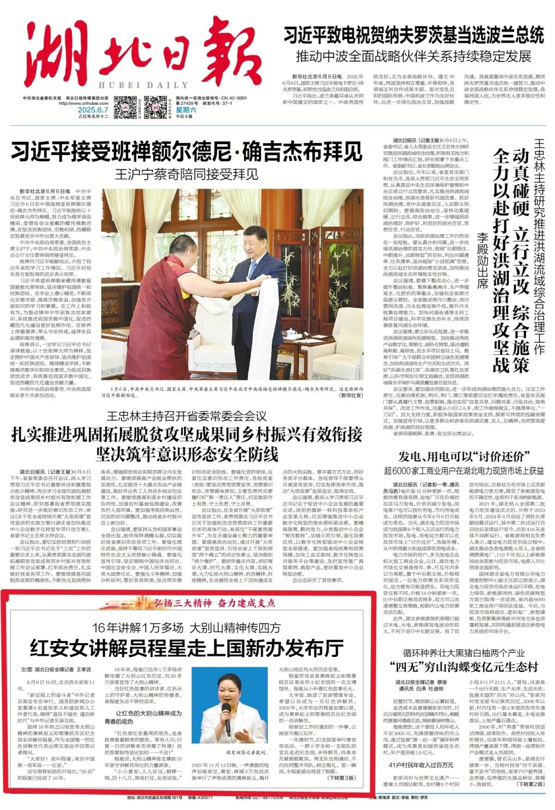 6月7日,湖北日报头版报道了红安女讲解员程星走上国新办发布厅,让大别山精神传四方。
