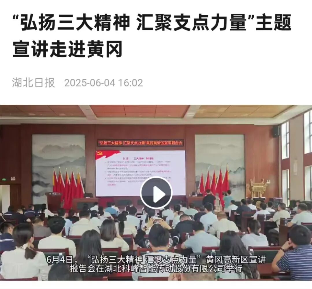 6月4日,湖北日报客户端推文《“弘扬三大精神 汇聚支点力量”主题宣讲走进黄冈》,报道省委宣讲团在湖北科峰智能传动股份有限公司围绕大别山精神、抗洪精神、抗疫精神“三大精神”作深入阐释和生动宣讲。