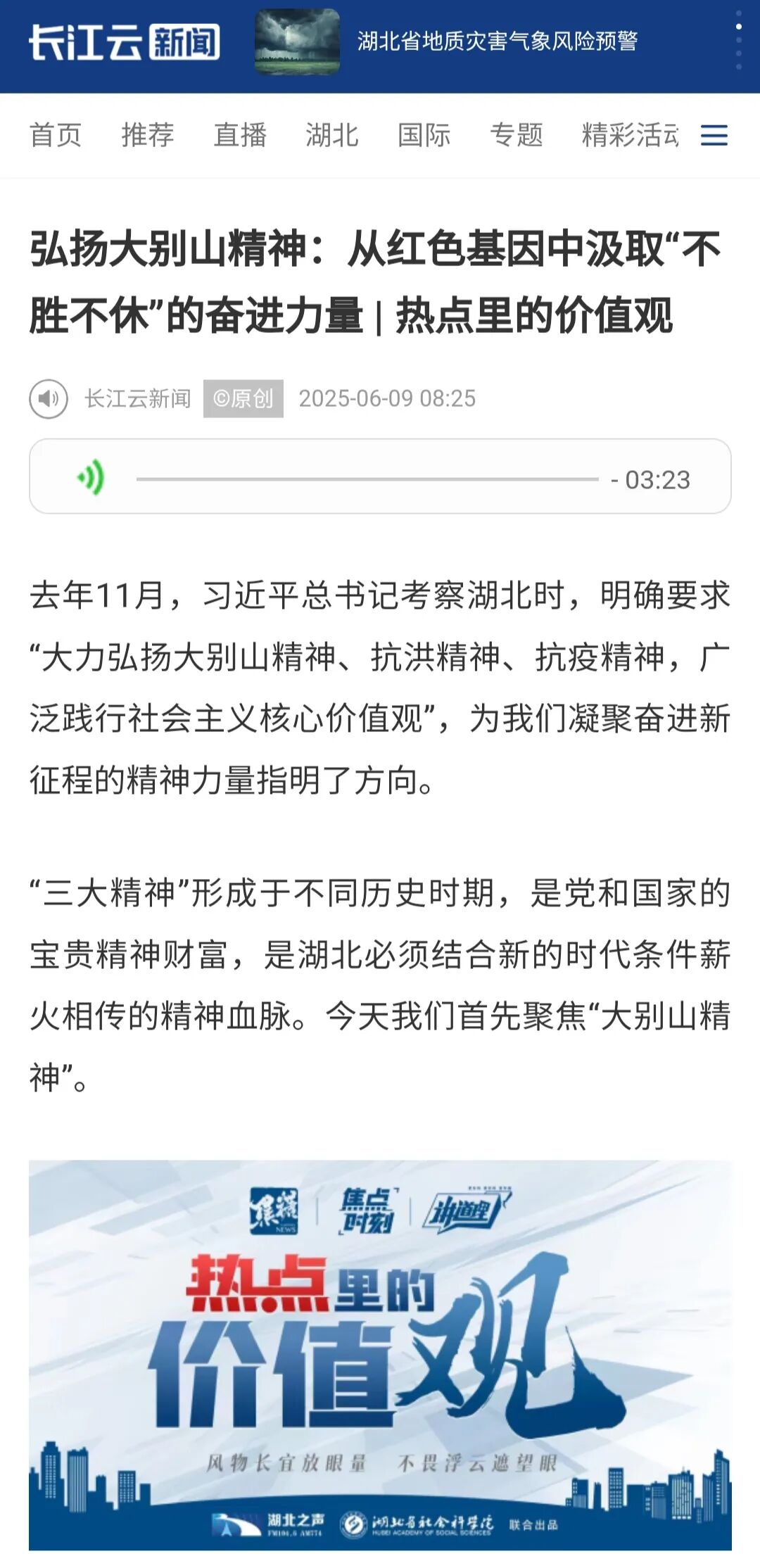 6月9日,长江云新闻报道大别山精神作为湖北宝贵精神财富的历史形成、核心特质及其在新时代的传承价值和弘扬路径,强调要赋予其新内涵并转化为推动发展的强大动力。