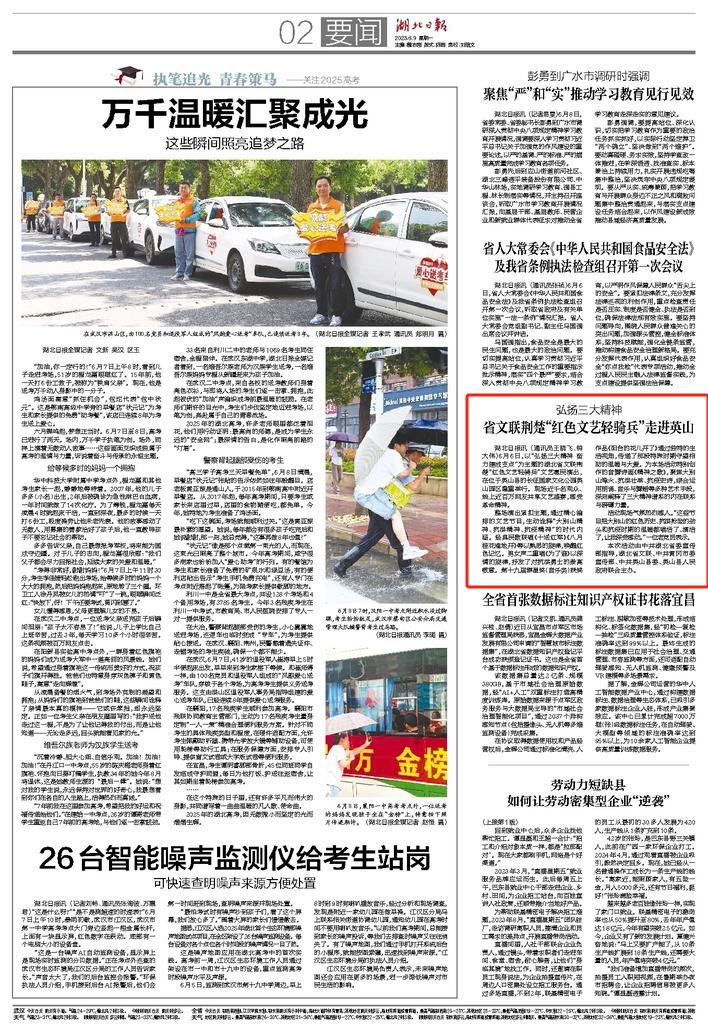 6月9日,湖北日报2版报道了省文联在英山长征国家文化公园举办主题文艺惠民演出,通过民歌、合唱、获奖作品及原创音舞诗画等丰富形式,生动诠释并弘扬了“大别山精神、抗洪精神、抗疫精神”三大精神谱系的内涵与力量。