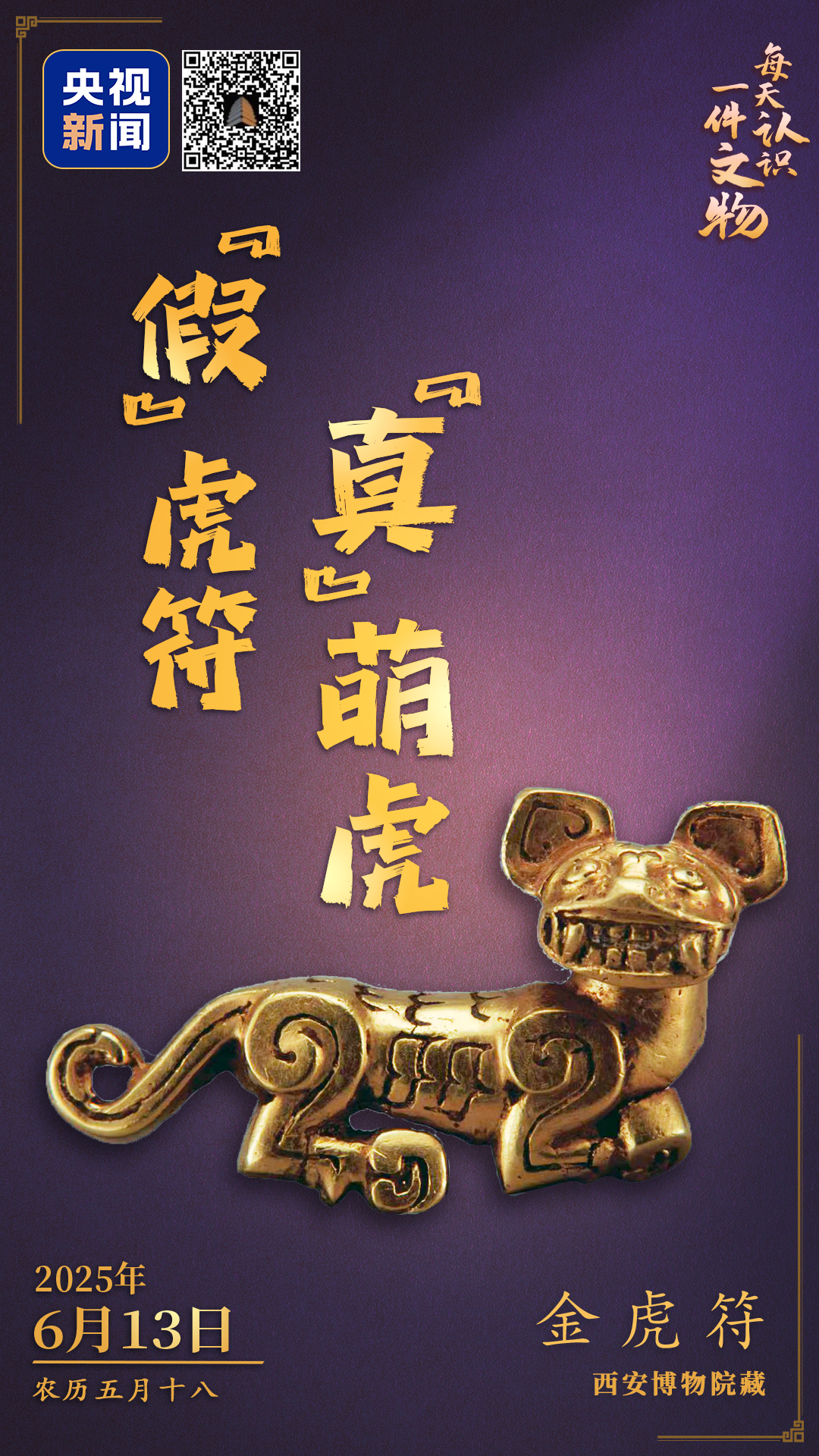 央视新闻联合全国博物馆推出文博科普产品《文博日历》,每天带你认识一件文物。金虎符,通体由纯金打造,花纹是浮雕加阴刻,工艺精致。然而它没有铭文,不具有调兵遣将的功能,专家推测其为仿⻁符之作。虽无“实权”,但它却凭借超萌外表,成为贵族们的心头好、掌中宝。
