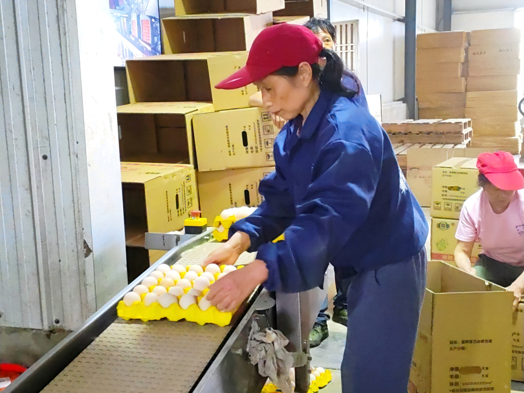 在蕲春县管窑镇学堂岗村,蕲祥生态畜禽养殖专业合作社的厂房内,一枚枚新鲜的鸡蛋通过传送带从鸡舍运送到分拣区,工人们双手上下翻飞,分拣、装箱、打包,动作娴熟而紧凑。