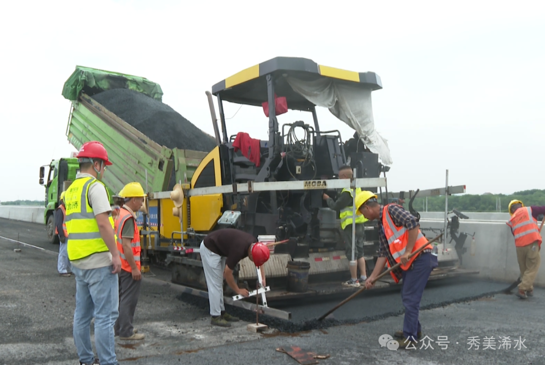 6月11日,在G347巴蕲公路一标段施工现场,摊铺机、压路机等大型设备往来穿梭,工人们正抢抓晴好天气推进路面施工。