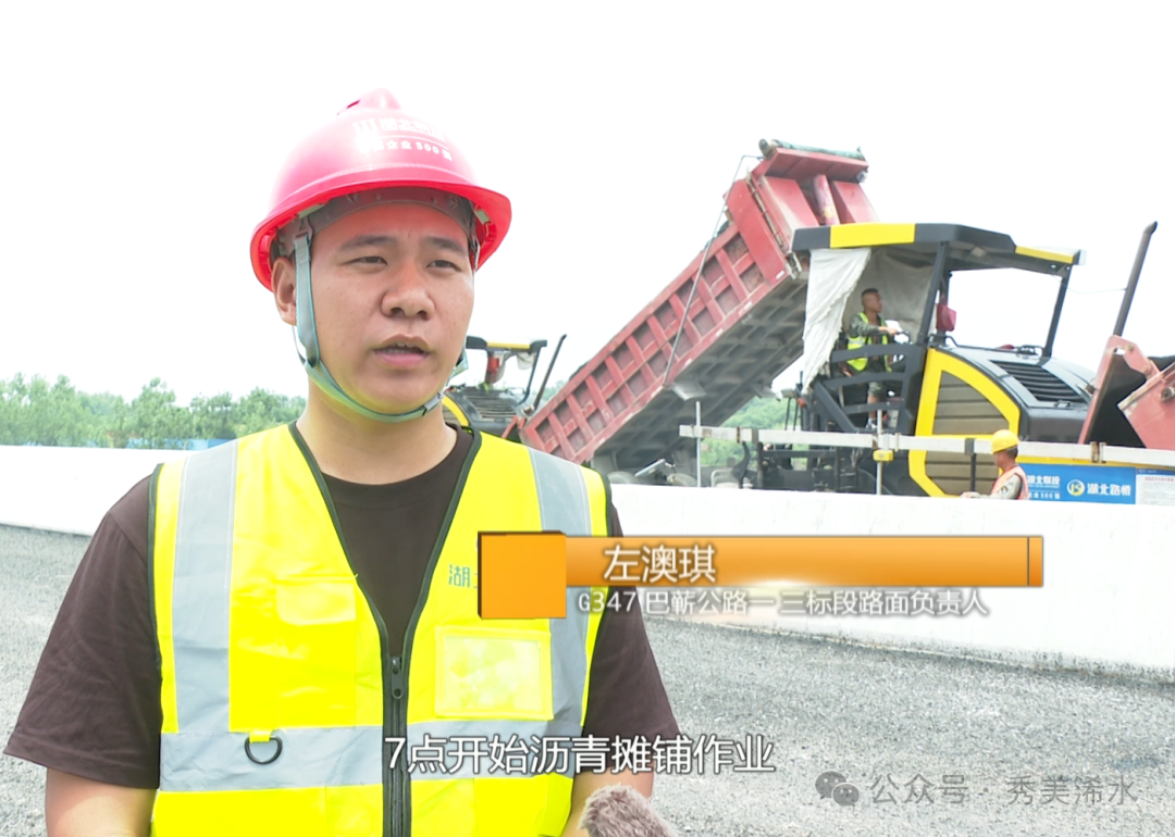 G347巴蕲公路一、三标段路面负责人 左澳琪:为缩短工期,路面工区狠抓有利天气,每天早上5点做准备工作,7点开始沥青摊铺作业,现场安排辅助工及设备操作手40余人,配备运输车、摊铺机、压路机等机械设备38台,每天施工时间在12小时以上,剩余路面工程将在5个工作日内完成。